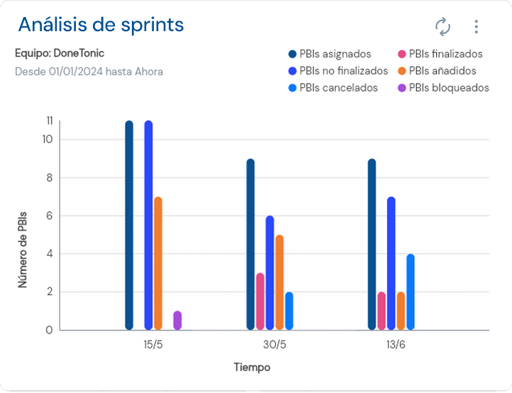 La métrica «Análisis de Sprints» proporcionada por DoneTonic ofrece una perspectiva clara del rendimiento del equipo, lo que conlleva a la identificación de problemas y al ajuste de estrategias. A través de representaciones gráficas de los estados de los PBIs, los equipos están en condiciones de evaluar su progreso, optimizar sus procesos y perfeccionar su colaboración.
