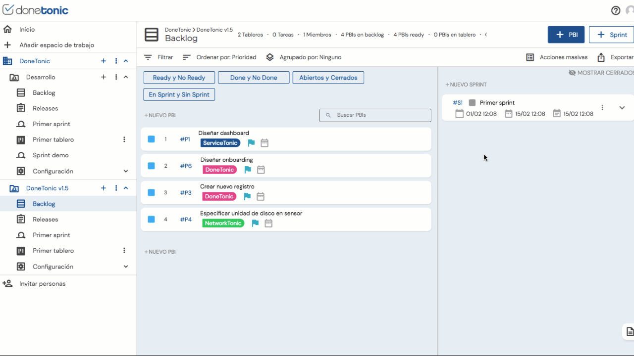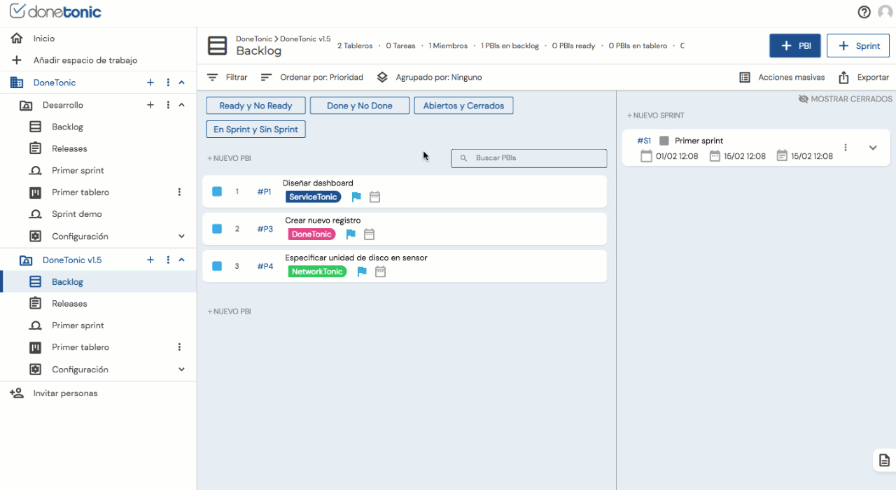 DoneTonic te ofrece varias maneras para que puedas mover los distintos PBI que conforman tu proyecto y ordenarlos según tus prioridades.